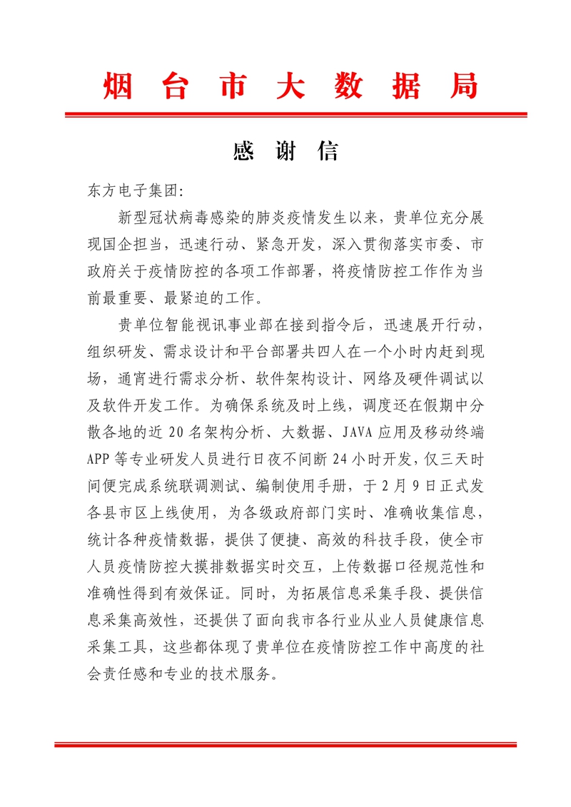 烟台市大数据局给公司的感谢信